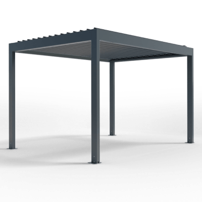 The Bioclimatic Aluminum Pergola features motorized rotating louvers that adjust from fully open to fully closed, giving you complete control over sunlight, ventilation, and rain protection. When open, the louvers allow air circulation and filtered light. When closed, they create a watertight roof with integrated guttering. Built from powder-coated aluminum with a freestanding or wall-mounted installation. Optional extras include LED lighting, infrared heaters, and glass sliding walls.